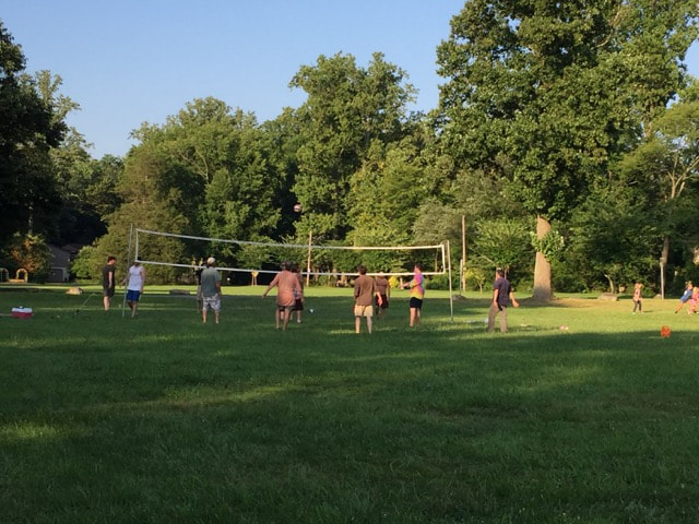 The Arden Craft Shop Museum partnered with Arden resident Jeff Martin to put on a Pickin’ Picnic on the Village Green on Sunday, July 15, 2018. Everyone brought their favorite summertime dish to share and it was quite a feast. The Museum opened the Bernie Schwab Room for use by the picnicking folks. It rained early that morning but the Green was dry by the afternoon when volunteers set up for the event. All sorts of games were played on the grass, including a full setup for volleyball.